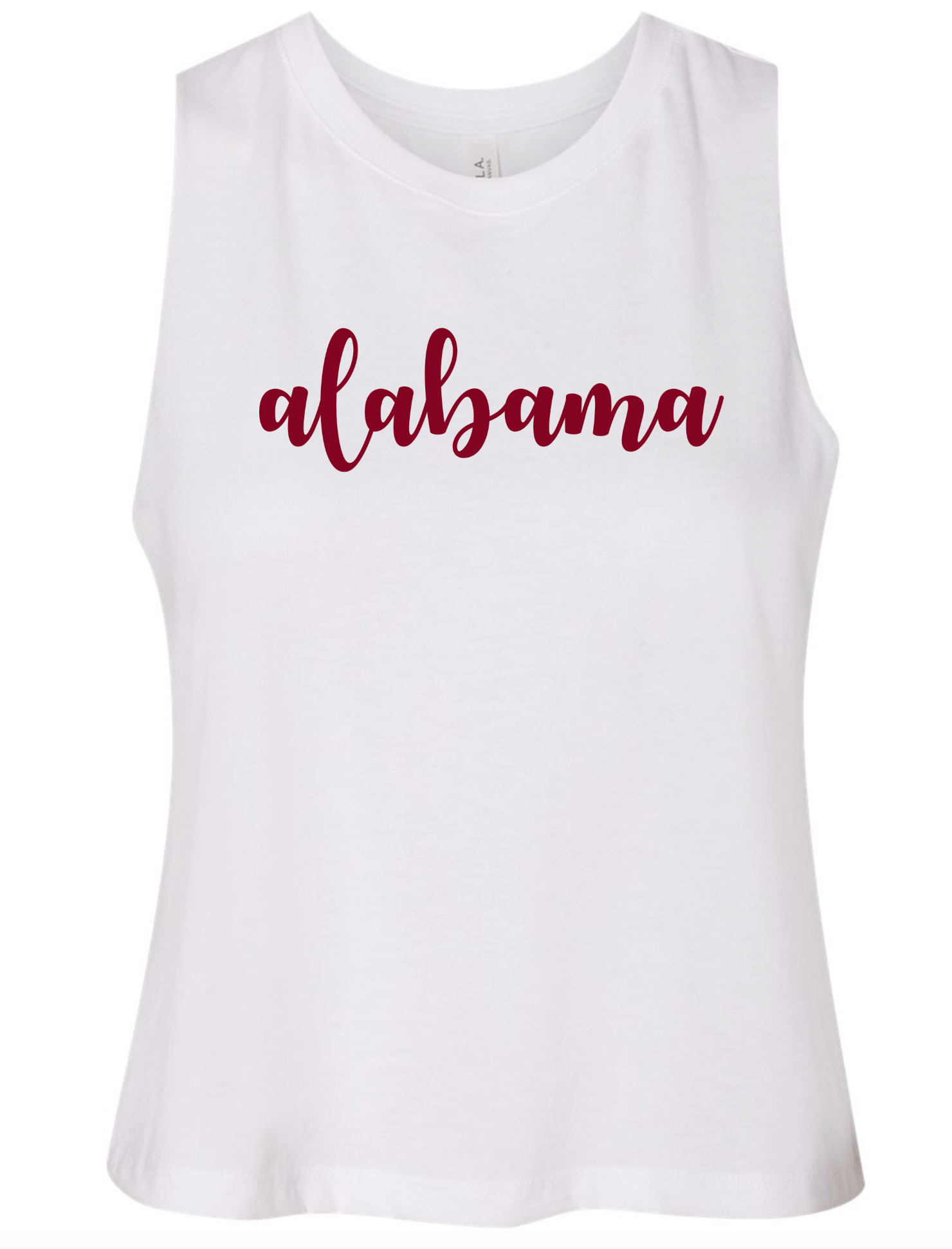 Alabama script design on Bella Canvas Crop Racerback Tank (white)