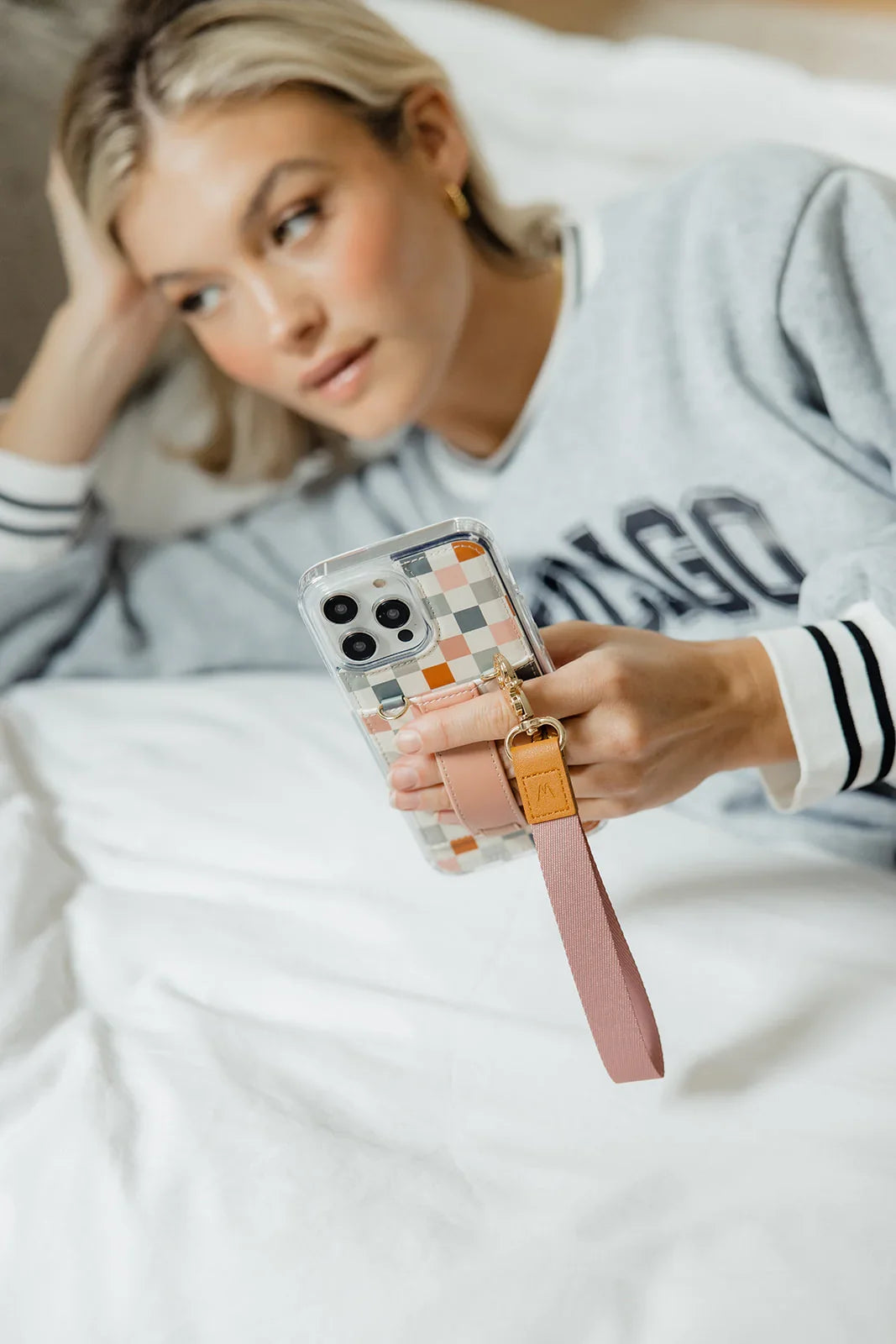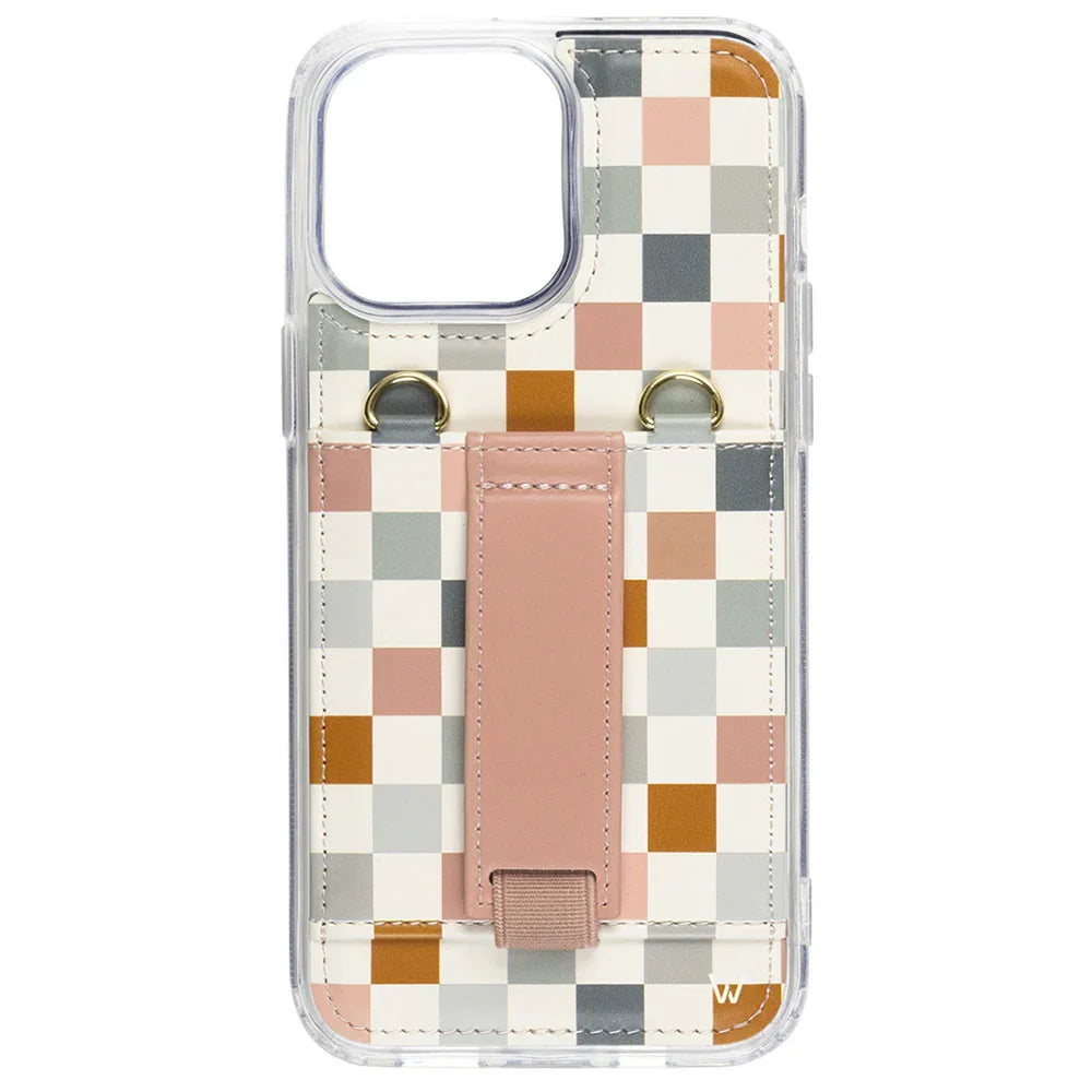 Case Design: Pink, blue, grey, and rust checker