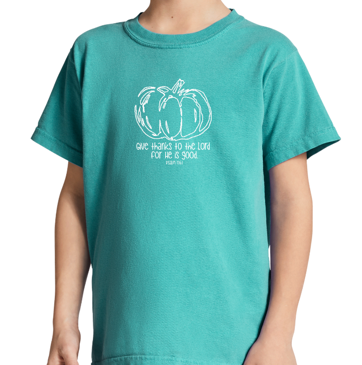 Give Thanks to the Lord pumpkin design on comfort color chalky mint.