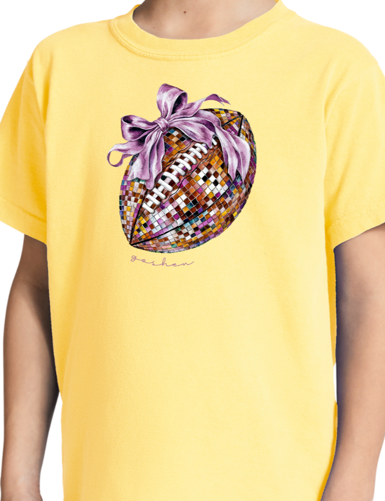 Goshen disco football design on white gildan softstyle unisex or comfort color butter short sleeve