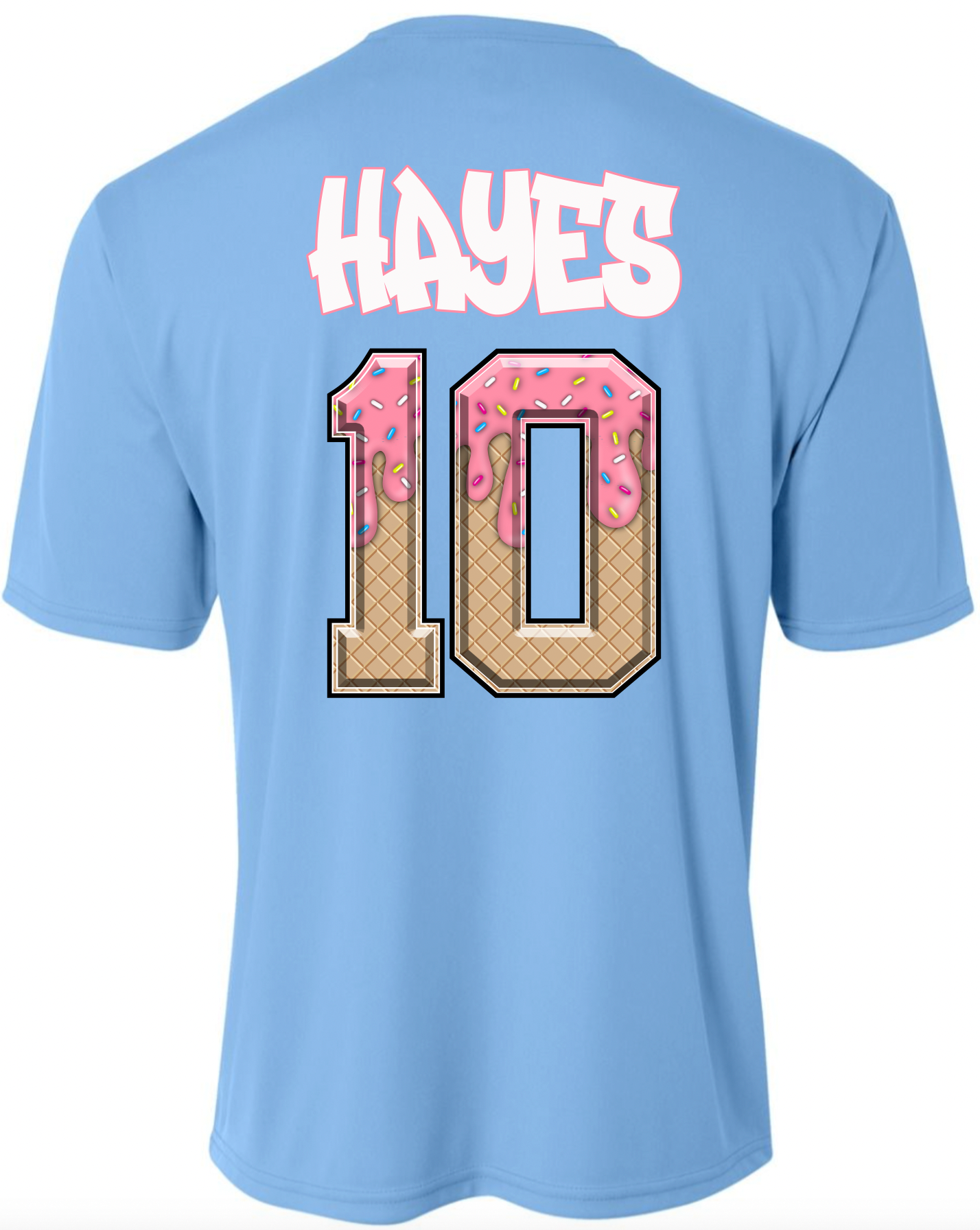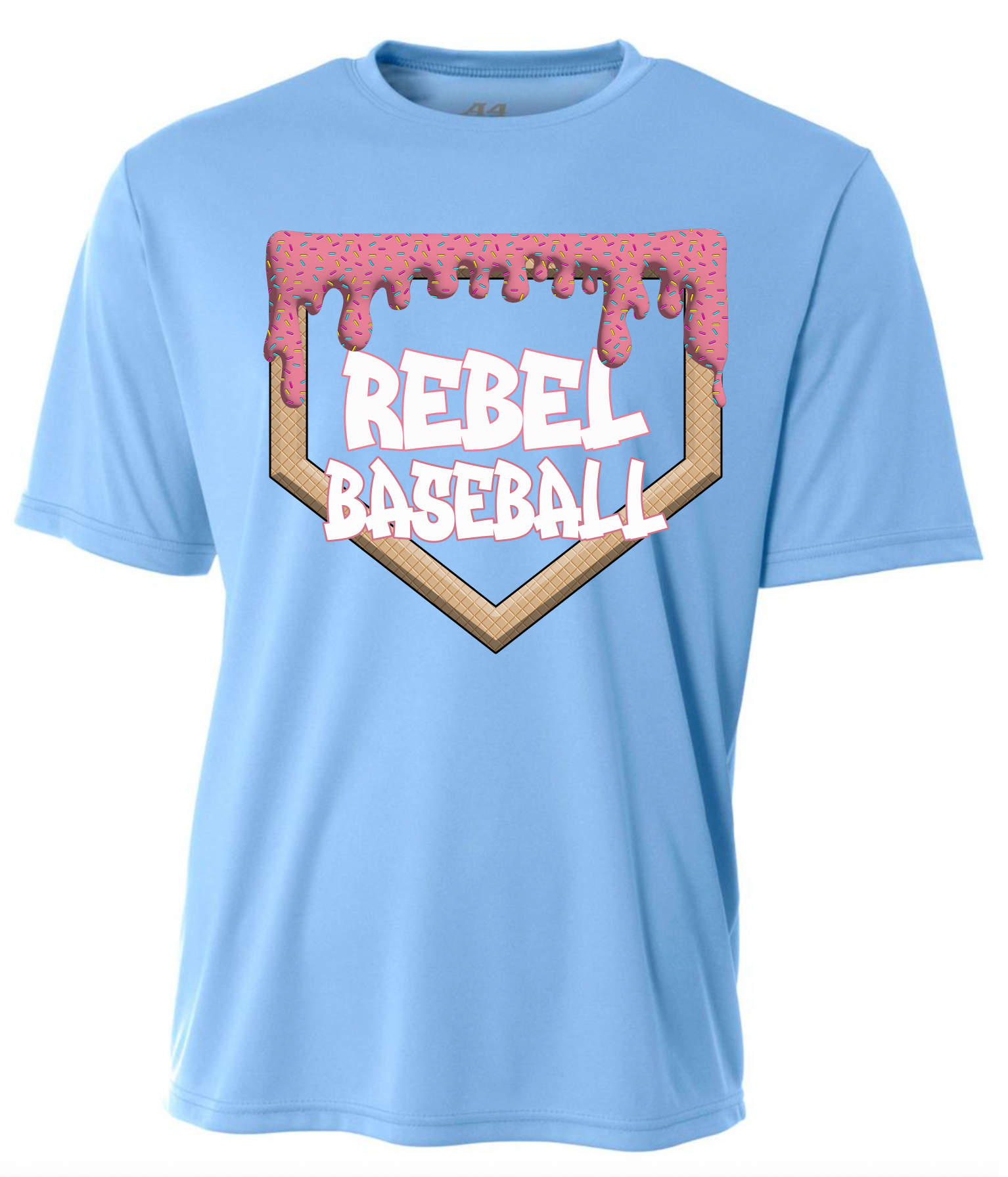 Pink Rebel Baseball Drip Jersey on light blue A4 cooling performance tee.