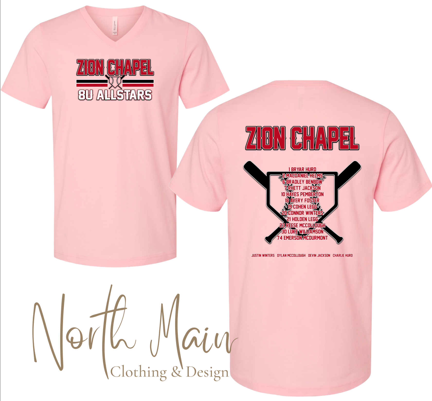 2025 Zion Chapel 8U Baseball Roster Design on Pink Bella Canvas Short Sleeve Jersey Tee (unisex v-neck for adult sizes, crew neck for youth sizes)
